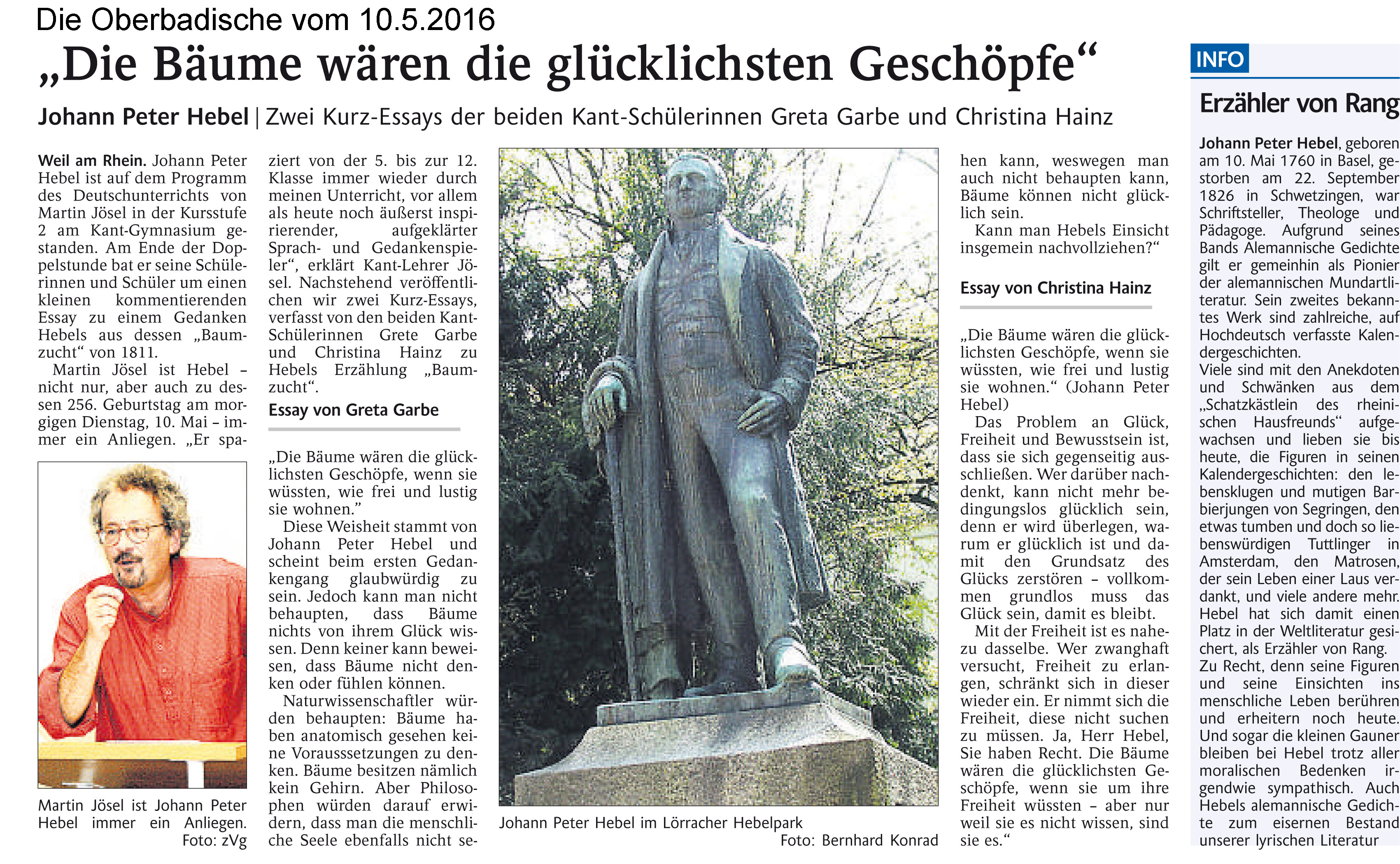 Der alemannische Dichterfürst ist Namensgeber für zahlreiche Preise und Ehrungen. Der Hebelpreis geht in diesem Jahr an den Dramatiker Lukas Bärfuss, der Liedermacher Uli Führe erhielt den Hebeldank und der Lyriker José F. A. Oliver wurde mit der Johann-Peter-Hebel-Gedenkplakette ausgezeichnet. HB mehr>